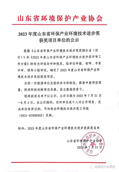 | 山東省環(huán)保產(chǎn)業(yè)環(huán)境技術(shù)進(jìn)步獎 | 省級 | 山東省環(huán)境保護(hù)產(chǎn)業(yè)協(xié)會 |