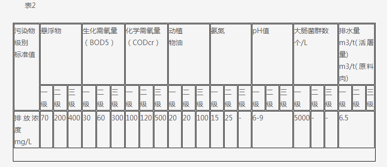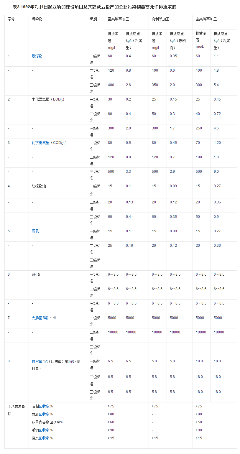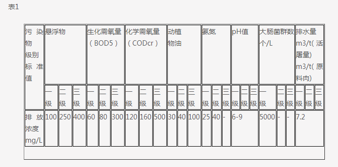 本標(biāo)準(zhǔn)按廢水排放去向,分年限規(guī)定了肉類加工企業(yè)水污染物最高允許排放濃度和排水量等指標(biāo)。