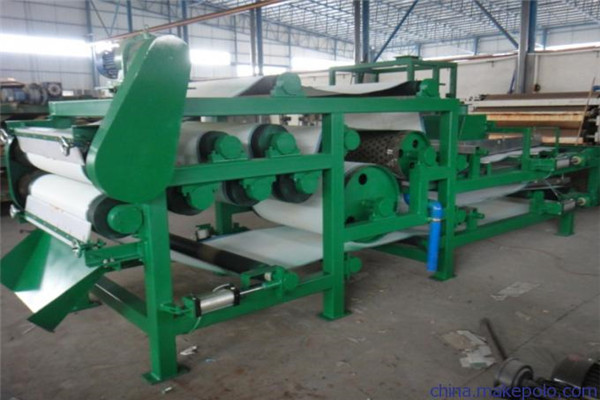 帶式壓濾機,即通過皮帶擠壓,兩層濾布夾住泥漿,然后通過設備的濃縮段過濾水,再通過設備“S”區的滾筒對泥漿進行壓榨脫水。