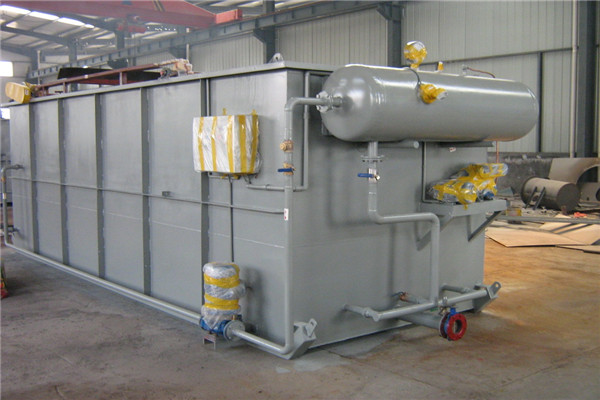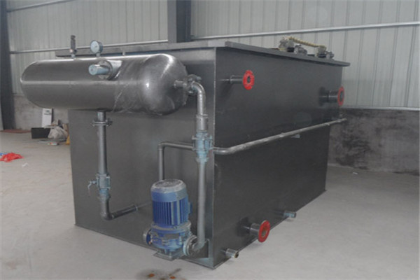 平流溶氣浮機將部分待處理水加壓至0.3-0.4兆帕,與壓縮空氣同時進入容器罐,在容器罐中完成溶氣過程(空氣充分溶入水中)。溶氣水通過管道進入安裝在氣浮池接觸室的溶氣釋放器。釋放器將溶氣水壓力突然降至常壓,釋放器釋放出微小的氣泡。氣泡與顆粒接觸粘附后,在氣浮分離室進行固液分離。出水通過穿孔集水管均勻收集,送入下游處理單元。浮渣被刮渣機刮進排渣槽,沉淀的污泥從污泥斗排出。