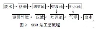 食物廢水包括酒精、啤酒、味精、淀粉、乳糖、檸檬酸、蔬菜加工和飲料加工等過程中產生的廢水,這些廢水水質普遍較差,處理難度大,投資和運行費用高。并通過大量的工程實踐逐步驗證了SBR法的可行性及優越性,SBR法用于食品廢水的處理取得了滿意的效果。圖2列出了工藝流程。